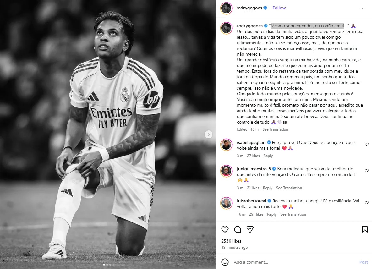 随后,罗德里戈在Instagram发文回应伤情: