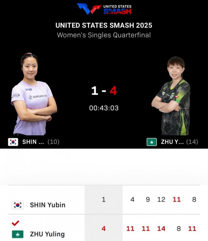 直播吧7月12日讯 在北京时间今天凌晨结束的WTT美国大满贯女单1/4决赛中,来自中国澳门的选手朱雨玲以4-1的大比分淘汰韩国名将申裕斌,晋级赛事四强。