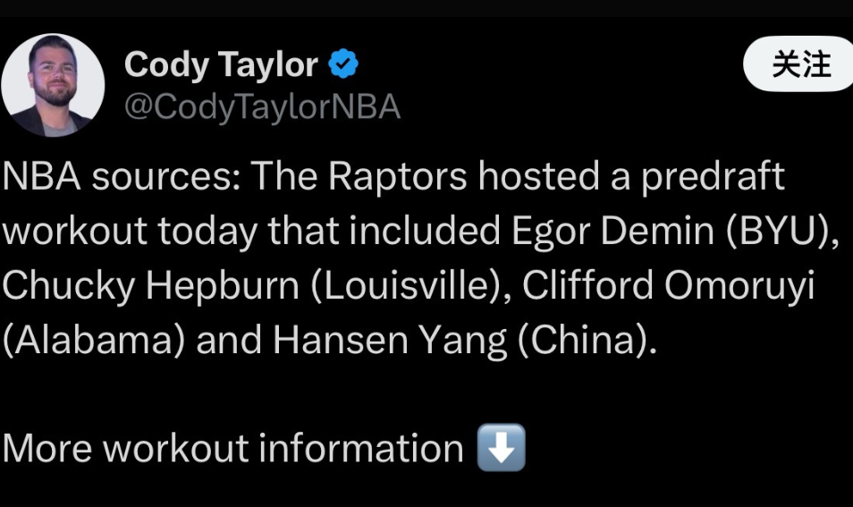 杨瀚森顺利试训猛龙,将回洛杉矶等后续试训安排,步行者基本无望